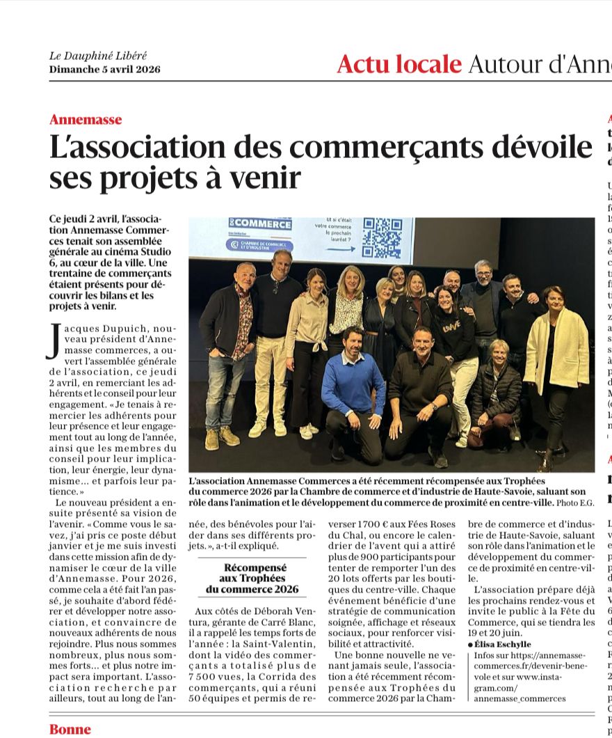 Récompensée récemment aux Trophées du Commerce 2026, l’association confirme ainsi sa volonté de jouer un rôle actif dans la vie locale et de faire rayonner le commerce de proximité à Annemasse.